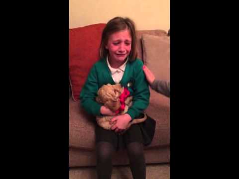 The girl immediately begins to cry from happiness — no, sob is more like it — exclaiming how cute the puppy is and how much she loves it. She even has the presence of mind to thank her parents in between tears.